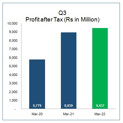 مالی سال 22-2021ء کی تیسری سہ ماہی کے لیے 9،437 روپے کے بعد از ٹیکس کا منافع ہوا۔ گزشتہ برس اسی مدت میں کمپنی کو 8،939 روپے کا بعد از ٹیکس منافع حاصل ہوا تھا۔ گزشتہ برس اسی مدت میں 14.09 روپے کے منافع فی حصص کے مقابلے میں 14.88 روپے کا منافع فی حصص حاصل ہوا۔ کمپنی کی جانب سے مالی سال 22-2021ء کی دوسری سہ ماہی کے لیے 25 فیصد کے درمیانی کیش ڈیوڈنڈ بھی تجویز کیا گیا۔