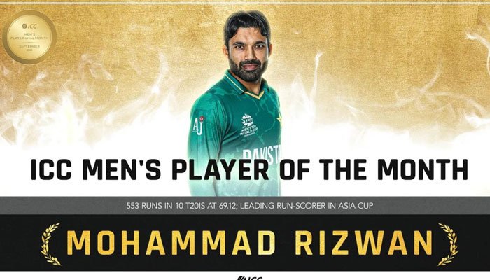 محمد رضوان کو ستمبر کے مہینے کا آئی سی سی مین پلیئر آف دی منتھ قرار دیا گیا ہے۔ رضوان ٹی ٹوئنٹی رینکنگ کے نمبر ون بیٹر بھی ہیں۔