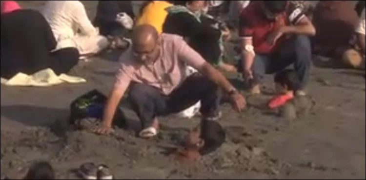 تفصیلات کے مطابق کراچی میں سورج گرہن کے موقع پر متعدد افراد اپنے اسپیشل بچوں کو لے کر ساحل پہنچ گئے، جہاں انھوں نے ذہنی اور جسمانی طور پر معذور بچوں کا جسم سمندر کی گیلی ریت میں دبا دیا۔