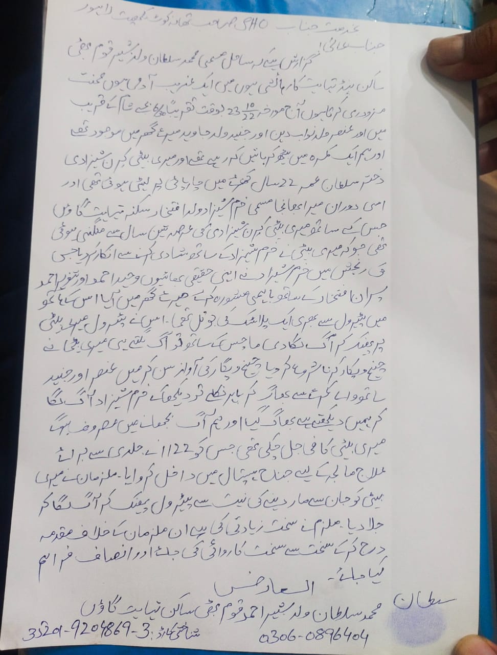 ملزم نے اپنے ساتھیوں وحید اور تنویر کے ہمراہ کرن کے گھر میں گھس کر اس پر پیٹرول چھڑک کرآگ لگادی اور موقع سےفرار ہو گئے۔