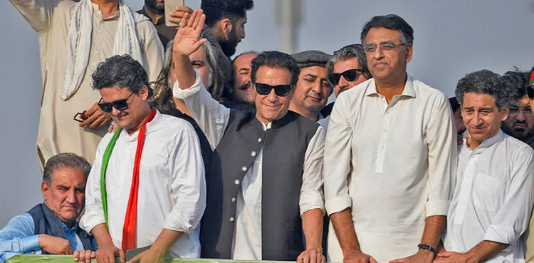 عمران خان نے حقیقی آزادی تحریک کی قیادت سنبھال لی، کنٹینر پر پی ٹی آئی رہنما اسد عمر، شاہ ،محمود قریشی ، فیصل جاوید ، شیخ رشید ، شفقت محمود سمیت دیگر قائدین عمران خان کے ہمراہ ہیں۔