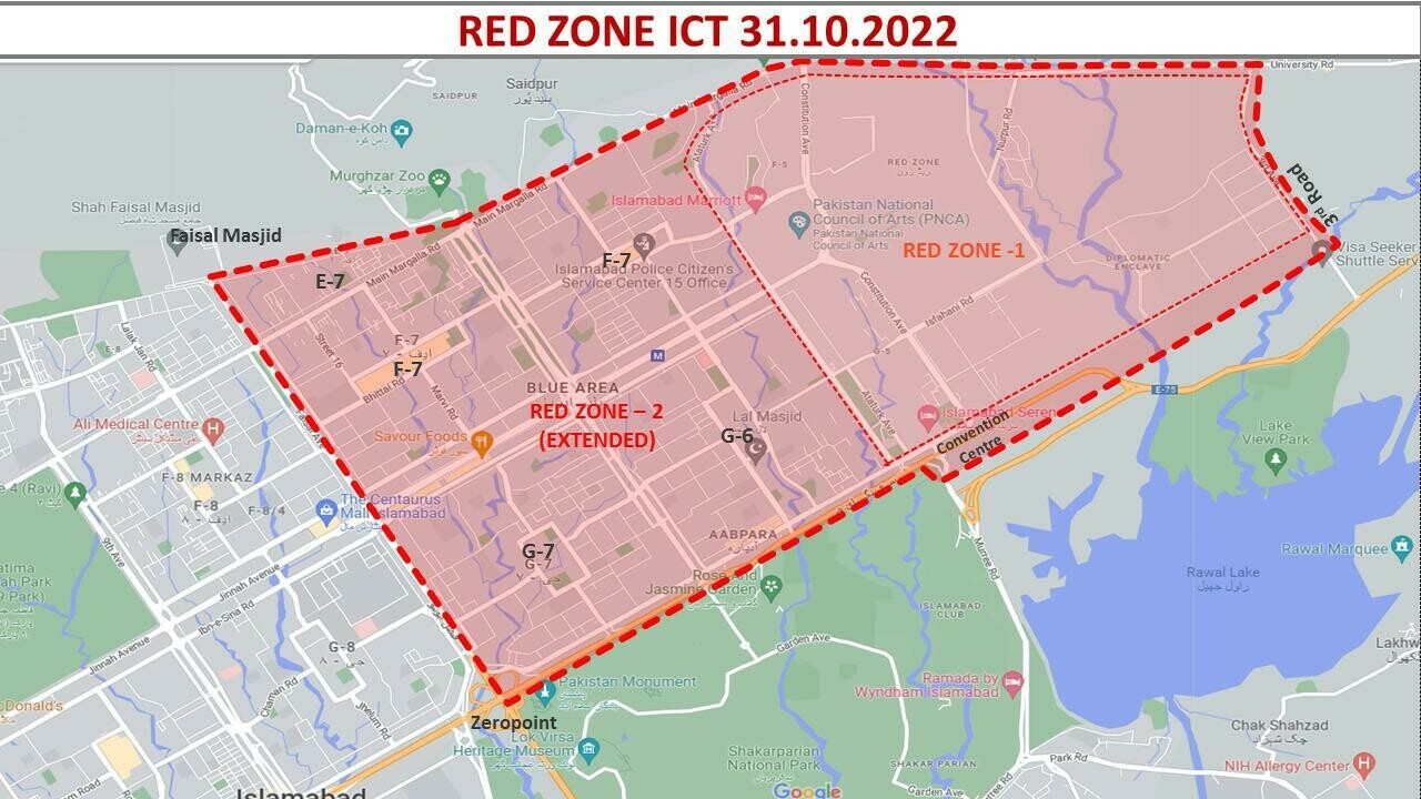 ریڈ زون کا دائرہ زیروپوائنٹ تک بڑھا دیا گیا اور نقشہ بھی جاری کردیا، ریڈ زون میں پولس ،رینجرز اور فوج تعینات ہوگی اور لانگ مارچ کے شرکاء کو ریڈ زون داخلے کی اجازت نہیں ہوگی۔
