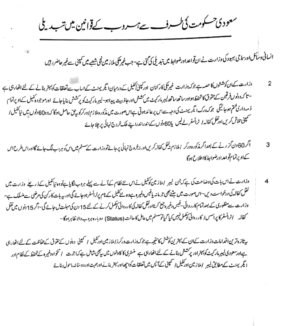 لیبر مارکیٹ کو پرکشش بنایا جائے اور موجودہ کفیل کے اوپر تمام ذمہ داری ختم ہوجائے گی جو کہ ورک ایگریمنٹ کی وجہ سے اِس پر عائد ہوتی ہے، اس صورت میں مذکورہ ملازم اور ورکرز کو یہ حق حاصل ہوگا کہ وہ ساٹھ دنوںمیں نیا کفیل یا کمپنی تلاش کریں اور نقل کفالہ ٹرانسفر لے لیں یا پھر ساٹھ دنوں کے اندر اندر اپنے ملک خروج نہائی پر چلا جائے۔