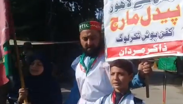 تحریک انصاف کا کارکن بچوں سمیت پیدل سفر کرکے مردان سے زمان پارک پہنچ گیا۔