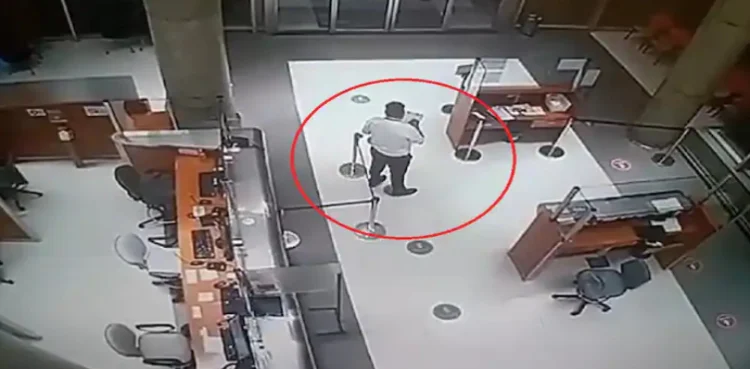 ویڈیو میں دیکھا جسکتا ہے کہ سی سی ٹی وی فوٹیج میں گارڈ تو دیکھائی دے رہا ہے مگر سامنے کون موجود ہے؟ وہ کیمرے کی آنکھ سے اوجھل ہے۔