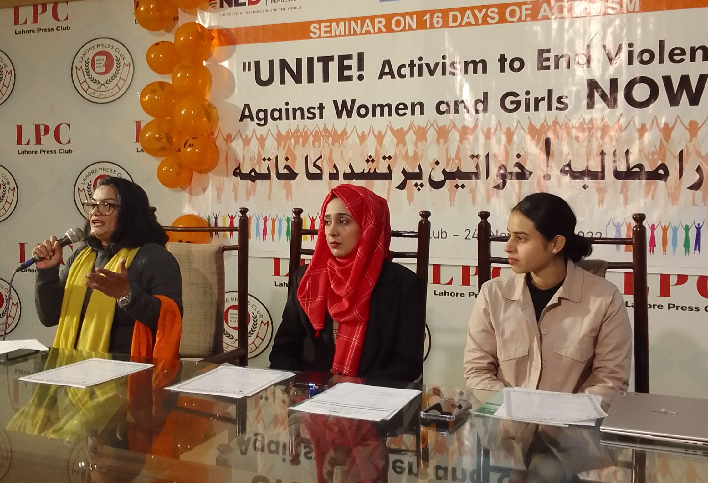 لاہور پریس کلب کے نثار عثمانی ہال میں منعقدہ سیمینار میں مقررین کا کہنا تھا کہ عورتوں پر ہر طرح تشدد کے خلاف آواز بلند کرنا وقت کی اہم ضرورت ہے ، خواتین کے خلاف تشدد ہماری آئندہ نسلوں کو بہتر انسان بنانے کی راہ میں سب سے بڑی رکاوٹ ہے ، آزاد اور بےخوف عورت ہی ایک آزاد اور خوش حال معاشرے کو ترتیب دے سکتی ہے ۔