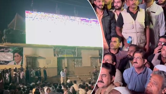 وزیراعلیٰ سندھ سید مراد علی شاہ لیاری میں مولوی عثمان پارک پہنچ گئے جہاں سکرین پر برازیل اور کوریا کے درمیان فٹ بال میچ دکھایا جا رہا ہے۔