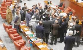 پی ٹی آئی کے سیینٹرز اس موقع پر نعرے لگاتے رہے کہ ’اعظم سواتی کو رہا کرو‘۔ اور نشستوں پر کھڑے ہو کر بھی احتجاج شروع کر دیا۔