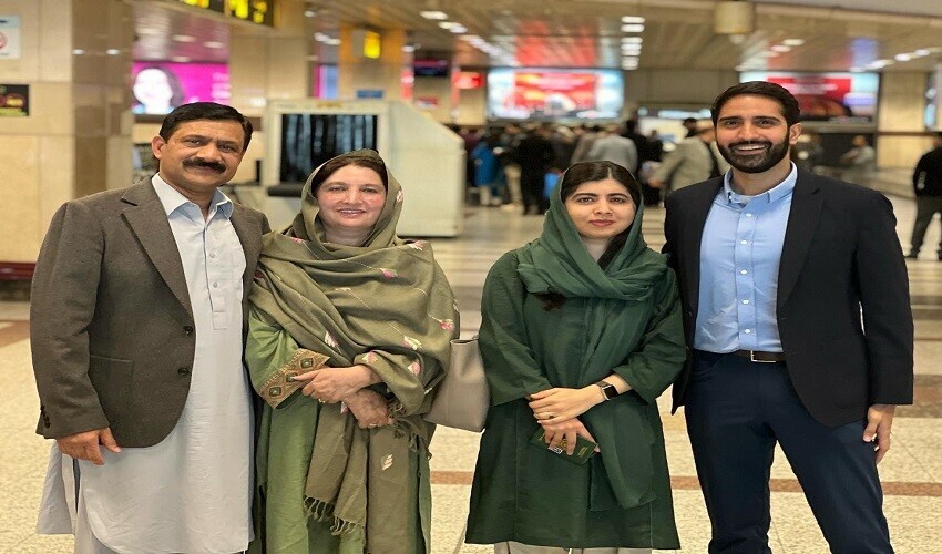 نوبل انعام یافتہ ملالہ یوسف زئی والد اور شوہر کے ہمراہ پاکستان پہنچ گئیں۔