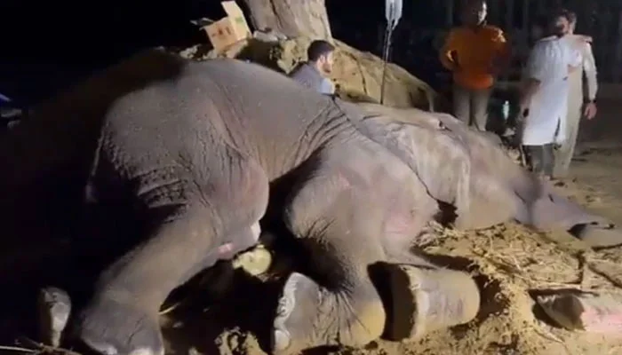 ہتھنی نور جہاں کو پچھلی ٹانگوں میں درد کے باعث اٹھنے میں مشکلات ہیں۔