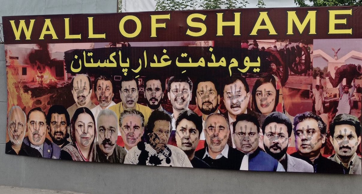 کچہری چوک کے قریب وال آف شیم کے نام سے بڑا بینر بھی آویزاں کردیا گیا ہے جس پر پی ٹی آئی کے 21 اراکین کی تصاویر آویزاں ہیں