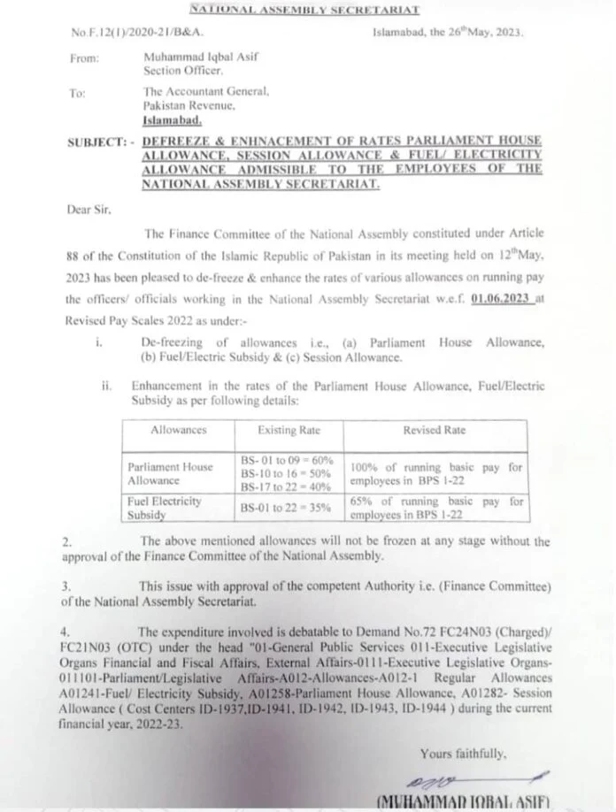 قومی اسمبلی فنانس کمیٹی نے 13 مئی کو الاؤنس ڈی فریز کرنے کی منظوری دی تھی اور اس اضافے کا اطلاق قومی اسمبلی سیکریٹریٹ کے ملازمین پر ہوگا۔