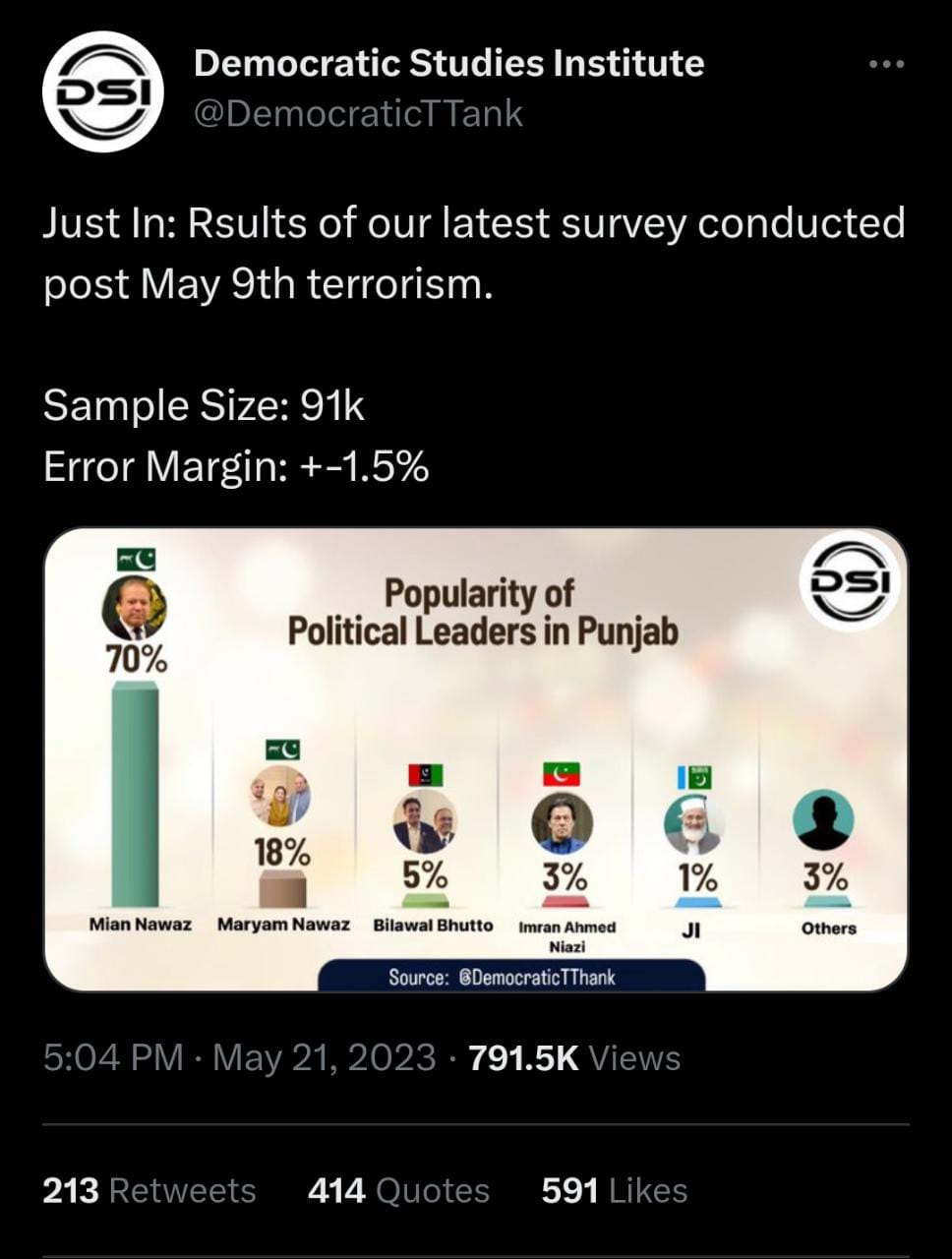 21 مئی کو ”ڈیموکریٹک اسٹڈیز انسٹی ٹیوٹ“ کے نام سے ایک ٹوئٹر اکاؤنٹ نے صوبے سے متعلق سروے کے نتائج شائع کیے جس میں دکھایا گیا کہ پاکستان مسلم لیگ (ن) کے رہنما نواز شریف کی مقبولیت کی درجہ بندی 9 مئی کے بعد 70 فیصد تک بڑھ چکی ہے