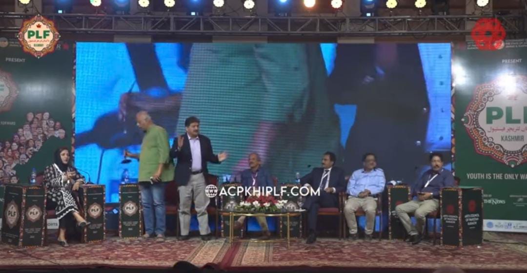 پروگرام کی میزبان” عاصمہ شیرازی ” نے ٹویٹ کرتے ہوئے ان کا کہنا ہے پاکستان لٹریچر فیسٹول” میں "مسئلہ کشمیر پر میڈیا کے کردار” پر سیشن کے دوران کشمیر پالیسی پر تنقید کی گئی، تالیاں بجاتے طلباء نے آزادی کشمیر پر نعرے بازی کی۔ وسعت اللہ خان اور حامد میر نے نعرے بازی پر اظہار ناراضی کیا کہ یہ جلسہ نہیں اور احتجاجا واک آؤٹ کا کہا تو طلباء خاموش ہو گئے۔ پروگرام اسی تسلسل سے دوبارہ شروع ہوا۔