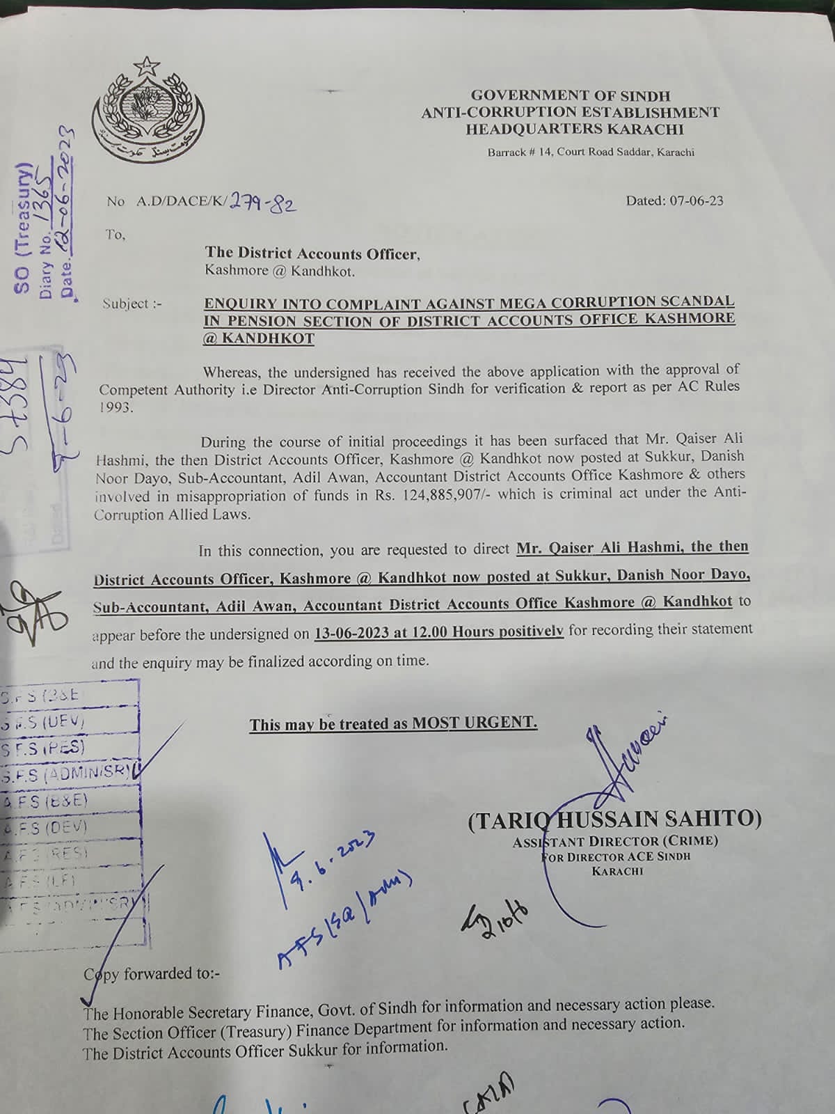 کراچی ( رپورٹ شکیل نائچ ) محکمہ اینٹی کرپشن نے ضلع کشمور میں پنشن فنڈز میں 12 کروڑ 48 لاکھ 85 ہزار 907 روپے کی بیقاعدگی کے الزام میں 3 افسران تحقیقات کا آغاز کرتے ہوئے انہیں طلب کرلیا ہے اس ضمن میں ڈسٹرکٹ اکاؤنٹس افسر کشمور سے تفصیلات طلب کرلی گئی ہیں اسسٹنٹ ڈائریکٹر ( کرائم ) محکمہ اینٹی کرپشن کی جانب سے ڈسٹرکٹ اکاؤنٹس افسر کشمور کو ایک مراسلہ ارسال کیا ہے جس میں کہا گیا ہے کہ انہیں ایک درخواست موصول ہوئی ہے جس کی منظوری مجاز اتھارٹی ڈائریکٹر محکمہ اینٹی کرپشن نے دی ہے جنہوں اینٹی کرپشن رولز 1993ء کے تحت تصدیق اور رپورٹ طلب کی ہے ابتدائی تحقیقات میں یہ بات سامنے آئی ہے اس وقت کے ڈسٹرکٹ اکاؤنٹس افسر قیصر علی ہاشمی ( اب وہ ڈسٹرکٹ اکاؤنٹس افسر سکھر تعینات ہیں ) ، سب اکاؤنٹنٹ دانش نور دایو ، اکاؤنٹس افسر ڈسٹرکٹ اکاؤنٹس آفس کشمور عادل اعوان اور دیگر 12 کروڑ 48 لاکھ 85 ہزار 907 روپے کی مالی بیقاعدگی میں ملوث ہیں جو کہ اینٹی کرپشن الائیڈ قوانین کے مطابق مجرمانہ عمل ہے اس ضمن میں گذارش کی جاتی ہے کہ قیصر علی ہاشمی ، دانش نور دایو اور عادل اعوان سے کہا جائے کہ ڈائریکٹر محکمہ اینٹی کرپشن کے سامنے پیش ہوجائیں تاکہ ان کا بیان لے کر تحقیقات کو مکمل کیا جاسکے اس مراسلہ کے بعد مذکورہ تینوں افسران نے ڈائریکٹر محکمہ اینٹی کرپشن کے دفتر میں آکر اپنے بیانات ریکارڈ کرالئے ہیں ۔