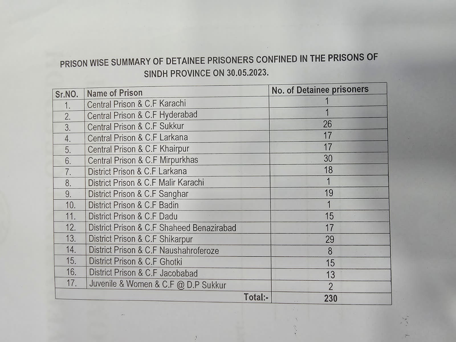 کراچی ( رپورٹ شکیل نائچ ) سندھ کی 17 جیلوں میں اس وقت پی ٹی آئی کے 230 کارکنوں کے ایم پی او کے تحت بند ہونے کا انکشاف ہوا ہے محکمہ داخلہ سندھ کی رپورٹ کے مطابق سینٹرل جیل کراچی ، سینٹرل جیل حیدرآباد ، ڈسٹرکٹ جیل ملیر ، ڈسٹرکٹ جیل بدین میں ایک ایک ، سینٹرل جیل سکھر میں 26 ، سینٹرل جیل لاڑکانہ میں 17 ، سینٹرل جیل خیرپور میں 17 ، سینٹرل جیل میرپورخاص میں 30 ، ڈسٹرکٹ جیل لاڑکانہ میں 18 ، ڈسٹرکٹ جیل سانگھڑ میں 19 ، ڈسٹرکٹ جیل دادو میں 15 ، ڈسٹرکٹ جیل شہید بینظیر آباد میں 17 ، ڈسٹرکٹ جیل شکارپور میں 29 ، ڈسٹرکٹ جیل نوشہروفیروز میں 8 ، ڈسٹرکٹ جیل گھوٹکی میں 15 ، ڈسٹرکٹ جیل جیکب آباد میں 13 اور بچہ جیل سکھر میں 2 قیدیوں کو رکھا گیا ہے جبکہ سندھ ہائی کورٹ کے حکم پر ایم پی او کے تحت گرفتار 26 افراد کو 7 جیلوں سے رہا کردیا گیا ہے ان میں سینٹرل جیل سکھر ، ڈسٹرکٹ جیل گھوٹکی سے ایک ایک ، ڈسٹرکٹ جیل دادو ، ڈسٹرکٹ جیل نوشہروفیروز سے دو دو ، سینٹرل جیل میرپورخاص سے 8 ، ڈسٹرکٹ جیل سانگھڑ سے 4 اور ڈسٹرکٹ جیل شہید بینظیر آباد سے 8 افراد کو رہا کردیا گیا ہے ۔