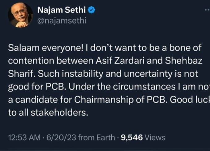 نجم سیٹھی نے ٹویٹ میں لکھا کہ سب کو سلام! میں آصف زرداری اور شہباز شریف کے درمیان وجہ تنازعہ نہیں بننا چاہتا۔ ایسا عدم استحکام اور غیر یقینی صورتحال پی سی بی کے لیے اچھی نہیں ہے۔ ان حالات میں میں پی سی بی کی چیئرمین شپ کا امیدوار نہیں ہوں۔ تمام اسٹیک ہولڈرز کو گڈ لک۔