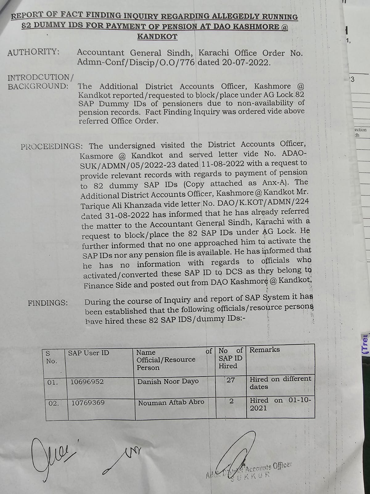 جس میں گذارش کی ہے کہ ان 82 ڈمی آئی ڈیز کو لاک کیا جائے انہوں نے بتایا کہ کسی نے بھی ان سے رابطہ نہیں کیا کہ ان ڈمی آئی ڈیز کو بحال کیا جائے نہ ہی کسی کا پنشن فائل دستیاب ہے انہوں نے بتایا کہ انہیں یہ علم نہیں کہ یہ آئی ڈیز ڈسٹرکٹ اکاؤنٹس آفس کشمور میں کس نے کھولیں