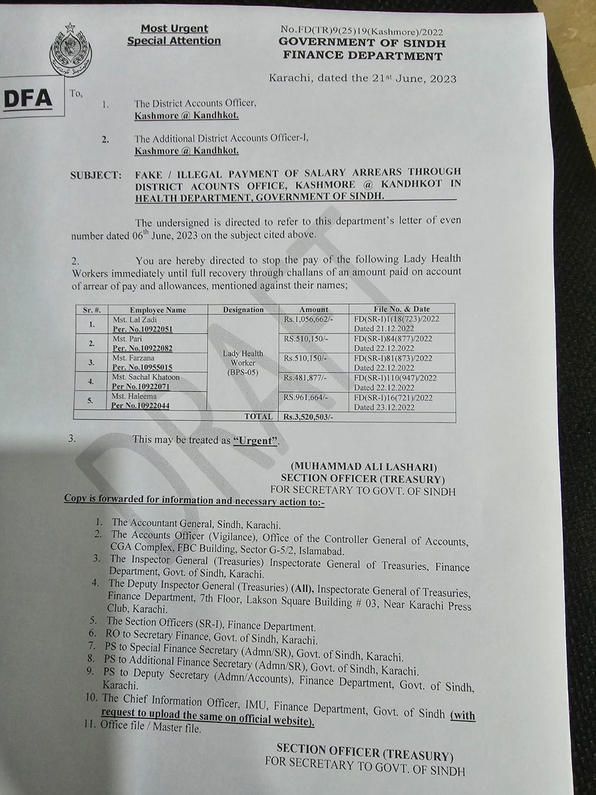 مراسلہ میں دونوں افسران کو حکم جاری کیا گیا ہے کہ فوری طور پر ان 5 لیڈی ہیلتھ ورکرز کو ادائیگیاں بند کی جائیں اور ان سے چالان کی شکل میں پے اینڈ الاؤنس کے واجبات کی مد میں مکمل رقم وصول کی جائے مراسلہ میں کہا گیا ہے کہ موسٹ ارجنٹ حکم ہے جس پر فوری طور پر عمل کرکے محکمہ خزانہ کو آگاہ کیا جائے ۔