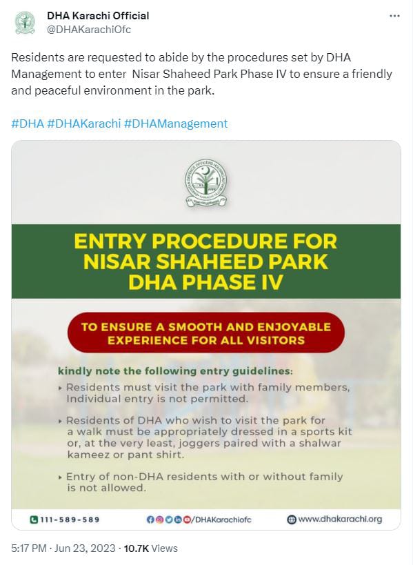 ہاؤسنگ اتھارٹی نے سوشل میڈیا پر جاری شرائط میں یہ بھی لکھا کہ وہ افراد جو ڈی ایچ اے کے رہائشی نہیں ان کا نثار شہید پارک میں داخلہ ممنوع ہے۔