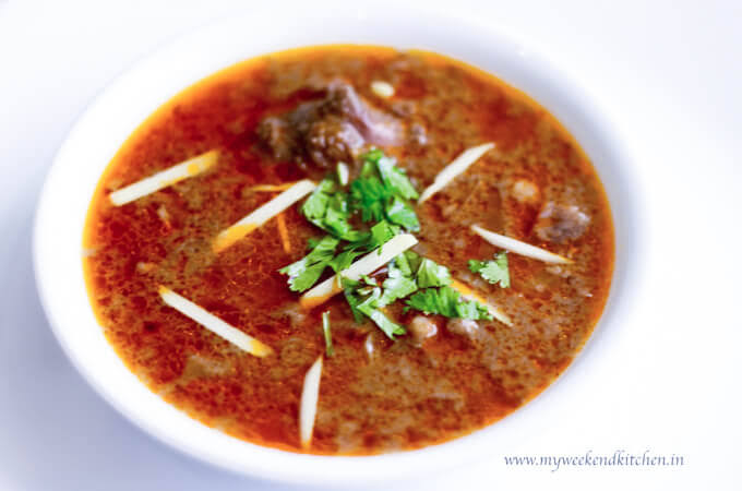 تیل ۔آدھا کپنمک ، حسبِ ذائقہترکیب:گوشت کو ادرک لہسن پیسٹ، پسی ہری مرچ، پسے پیاز، خشخاش اور دہی کے ساتھ ایک گھنٹہ میرینیٹ کریں۔ تیل گرم کرکے اُس میں پسے پیاز، کُٹی کالی مرچ، ہری الائچی، لونگ، تیز پات، اور زیرہ ڈال کر پانچ سے سات منٹ پکائیں تاکہ پیاز کا کچا پن ختم ہو جائے۔
