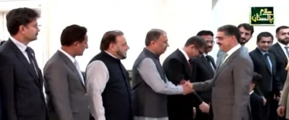 نگراں وزیراعظم انوارالحق کاکڑ عہدے کا حلف اُٹھانے کے بعد وزیراعظم ہاؤس پہنچے، جہاں انہوں نے عملے سے مصافحہ کیا۔