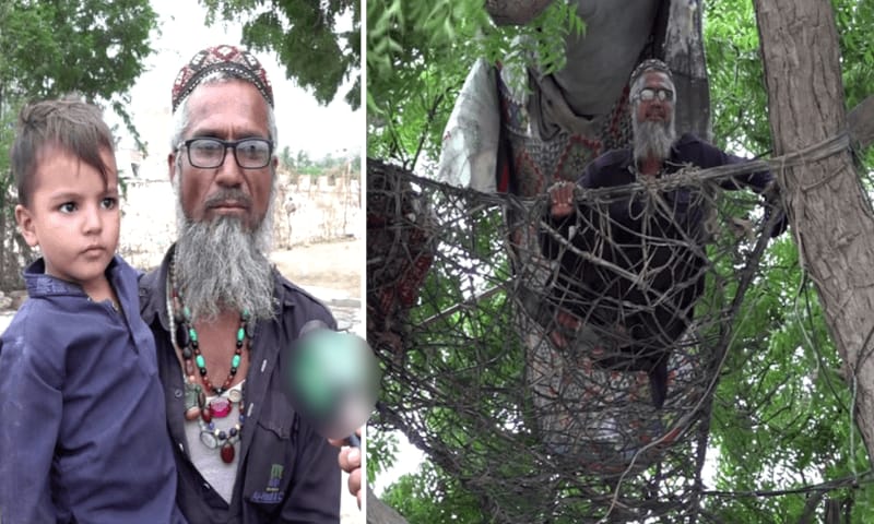 ملنگی عرف حبیب نے درخت کو اپنی چھت بناکر رہ رہے ہیں، ان کی عمر 50 سال سے زائد ہے لیکن اس پھرتی ایسی کہ تین منزلہ درخت عبور کرنا کوئی بڑی بات نہیں ہے۔