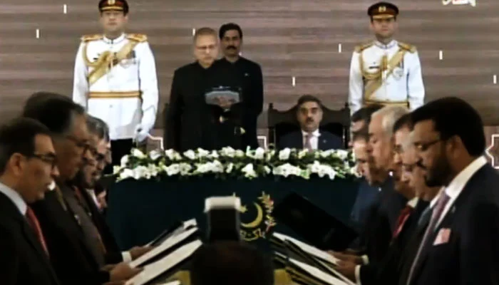 ایوان صدر میں نگراں وفاقی کابینہ نے حلف اٹھا لیا، صدرمملکت نے نگراں وفاقی کابینہ سے حلف لیا۔