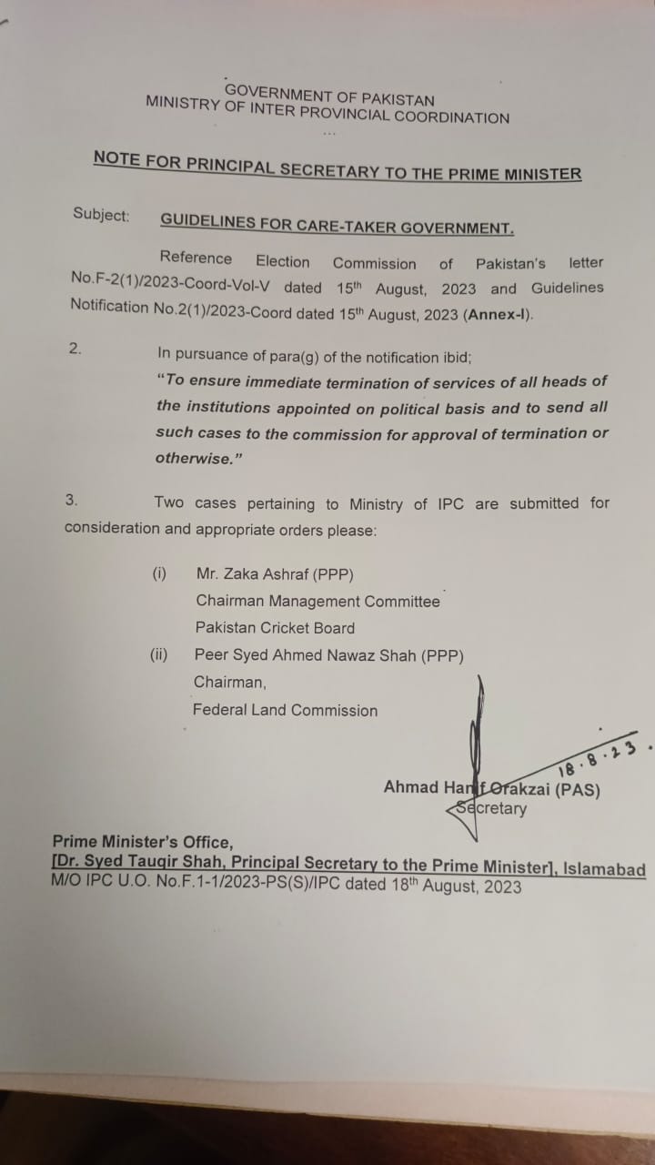 ذکا اشرف کو چیئرمین پاکستان کرکٹ بورڈ اور پیر احمد نواز شاہ کو چیئرمین فیڈرل لینڈ کمیشن کے عہدوں سے ہٹا دیا گیا ۔