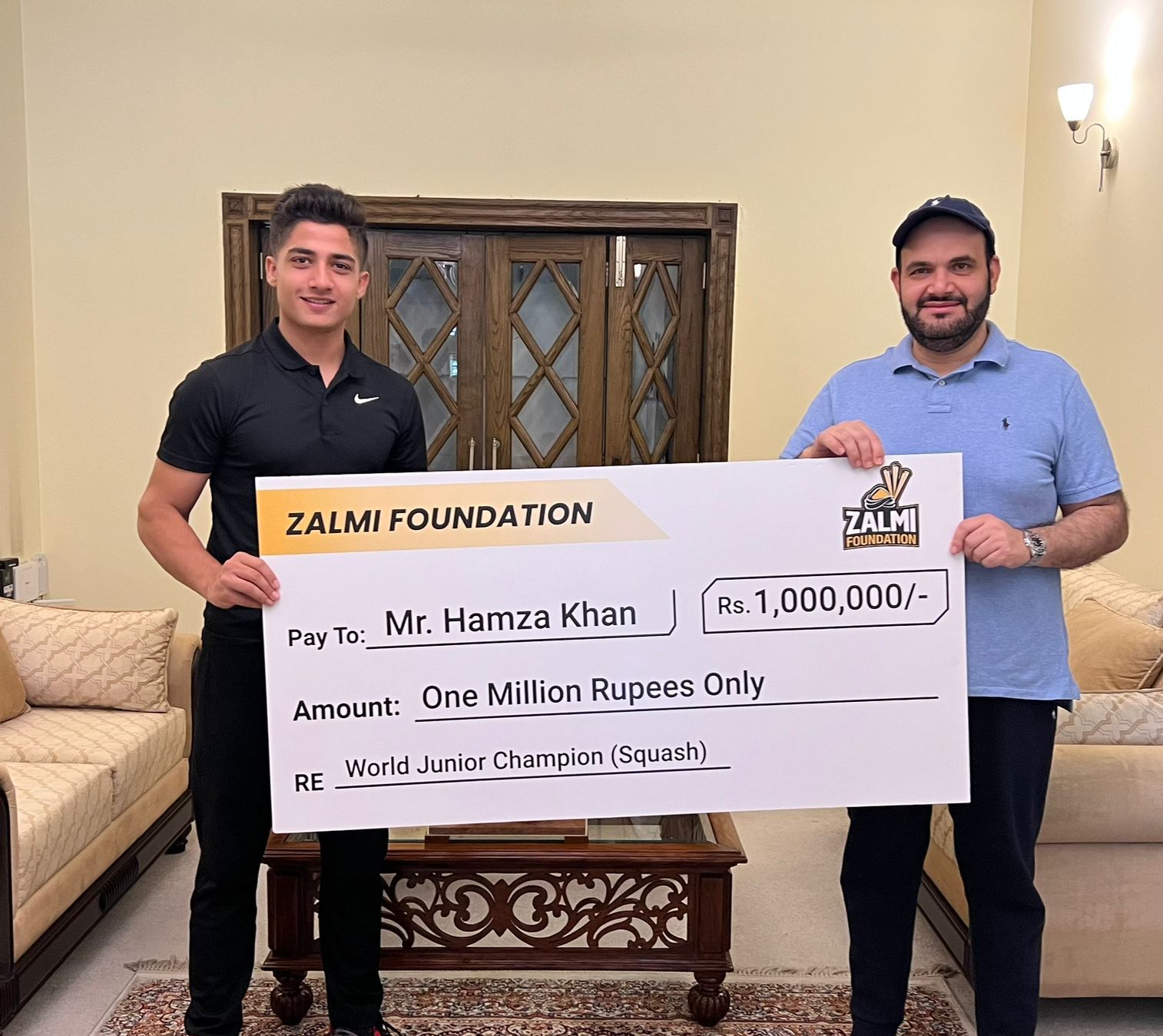 زلمی فاونڈیشن , زلمی فاونڈیشن کی جانب سے ورلڈ جونئیر اسکواش چیمپین حمزہ خان کو دس لاکھ روپے انعام کا چیک پیش کردیا گیا