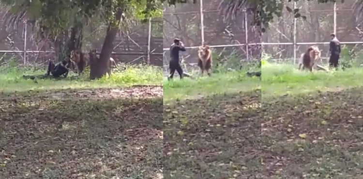 پس منظر میں لوگوں کی آوازیں بھی سنی جاسکتی ہیں جو اسے باہر آنے کا کہہ رہے ہیں، چند لمحوں بعد شیر اُس شخص کو پیچھے کی جانب دھکیل دیتا ہے۔