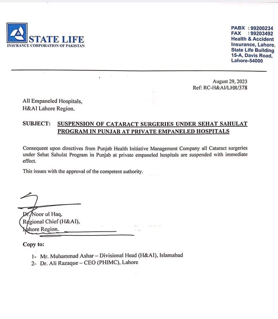 پنجاب میں صحت کارڈ پرائیویٹ ہسپتالوں میں مکمل طور پر بند کر دیا، سٹیٹ لائف انشورنس نے کنٹریکٹ معطلی کا نوٹیفکیشن جاری کر دیا
