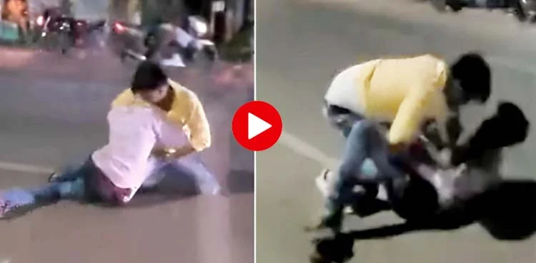 ویڈیو میں دیکھا جاسکتا ہے کہ سڑک پر ٹریفک رواں دواں ہے اور دونوں لڑنے میں مصروف ہیں۔