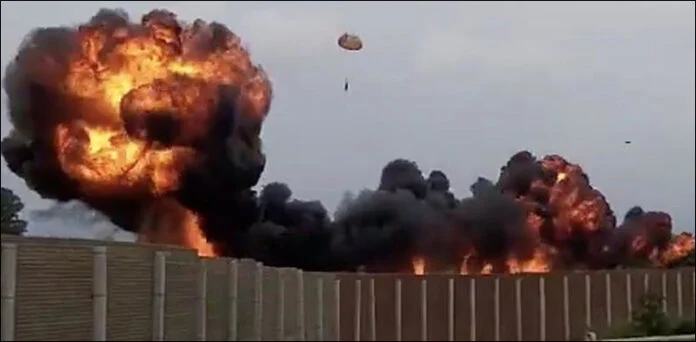 سوشل میڈیا پر سامنے آنے والی حادثے کی ویڈیو میں نو طیاروں کو دو سخت وی فارمیشنوں میں دکھایا گیا ہے، اس دوران ایک طیارہ قطار سے الگ ہو کر اچانک نیچے گرنے لگا، اسی اثنا میں پائلٹ ایئرپورٹ کی باڑ کے قریب ہی پیراشوٹ کے ذریعے اوپر کی طرف نکل کر بلند ہوا، اور طیارہ نے نیچے کی طرف یک بارگی غوطہ لگایا، اور اگلے لمحے زمین سے ٹکرا کر آگ کا گولہ بلند ہوا