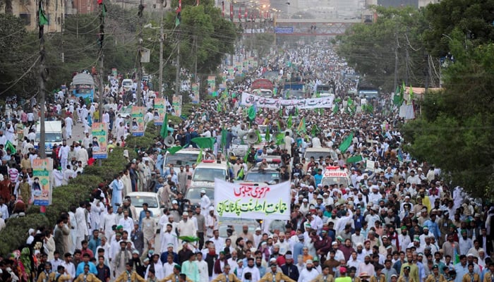 سرکارِ دو عالم حضرت محمد ﷺ کی ولادت کا جشن ملک بھر میں مذہبی عقیدت و احترام کے ساتھ منایا جا رہا ہے، عاشقانِ رسول صلی اللّٰہ علیہ وسلم کے جلوس مقرر کردہ راستوں پر گامزن ہیں۔