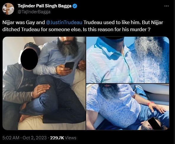 بھارت اور کینیڈا کے درمیان ہردیپ سنگھ نجر کے قتل کے بعد پیدا ہونے والی سفارتی کشمکش اس وقت دنیا بھر میں زیر بحث ہے۔ اس سنجیدہ نوعیت کے معاملے کے درمیان بھارتی جنتا پارٹی کے لیڈران اپنی خفت کو مٹا نے کے لئے اپنی تخلیقی صلاحیتوں کا بے ہنگم استعمال کر رہے ہیں۔ بھارتیہ جنتا پارٹی کے یوتھ ونگ یووا مورچہ (بی جے وائی ایم) کے سکریٹری تیجندر پال سنگھ بگا کی بھارتی اخبار میں رپورٹ ہونے والی ایک ٹویٹ کے مطابق مارا گیا سکھ علیحدگی پسند ہردیپ سنگھ ننجر ہم جنس پرست تھا اور کینیڈا کے وزیر اعظم جسٹن ٹروڈو اسے پسند کرتے تھے اور اسکے عاشق تھے۔