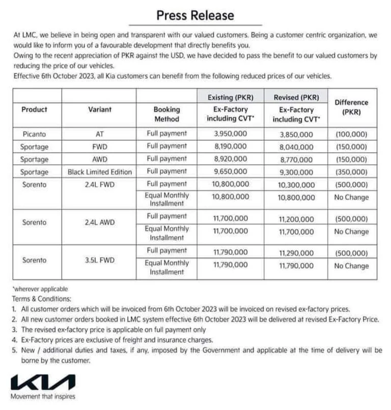 پاکستان میں گاڑیوں کے اسمبلر ’’کیا‘‘ لکی موٹر کارپوریشن نے ڈالر کے مقابلے میں روپے کی قدر میں اضافے کے پیش نظر اپنی گاڑیوں کے مختلف ماڈلز کی قیمتوں میں ایک سے 5 لاکھ روپے تک کی کمی کردی۔