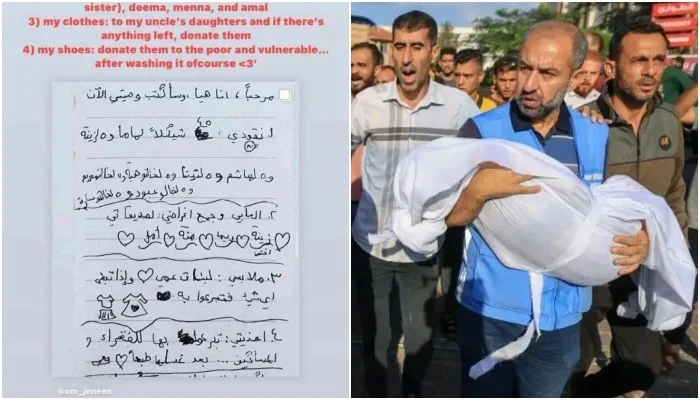 شہید فلسطینی بچی نے سادہ کاغذ پر لکھا کہ میری پاکٹ منی سے 45 شیکل میری ماں کو دیے جائیں، 5 شیکل میرے بھائی ہاشم اور 5 بہن ذینہ کو دیے جائیں، 5 شیکل دادی اور 5 پھوپھی کو دیے جائیں۔