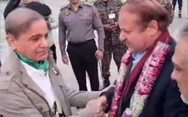 نواز شریف اپنے طیارہ کی سیڑھیوں سے نیچے اترے تو شہباز شریف نے آبدیدہ آنکھوں کے ساتھ گھنٹے چھو کر ان کا استقبال کیا۔