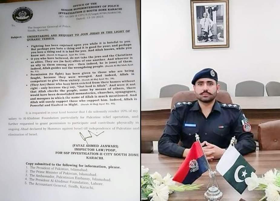تفصیلات کے مطابق کراچی کے ساؤتھ سٹی زون میں تعینات انسپکٹر رینک کے پولیس افسر فیاض احمد نے آئی جی سندھ پولیس کو خط لکھا تھا کہ اُنہیں اسرائیل کے خلاف لڑائی میں حصہ لینے کی اجازت دی جائے۔
