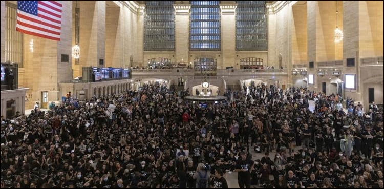 امریکی شہر نیویارک کے سینٹرل اسٹیشن میں غزہ میں جاری اسرائیلی جارحیت کے خلاف یہودیوں کی جانب سے بہت بڑا احتجاجی مظاہرہ اور دھرنا دیا گیا، جس پر نیویارک پولیس نے 300 افراد کو گرفتار کر لیا۔