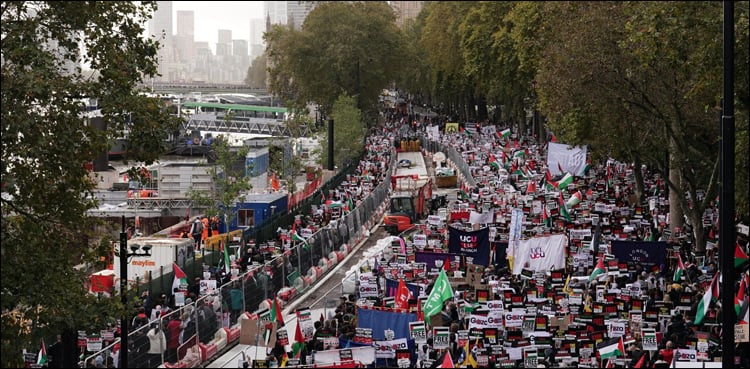 لندن میں لگاتار دوسرے ہفتے فلسطینیوں کے حق میں زبردست مظاہرے جاری ہیں، ہفتے کے روز ہونے والے ہزاروں افراد کے احتجاج کے بعد 9 افراد کو پولیس نے گرفتار بھی کیا جن میں سے پانچ پر نفرت انگیز نعرے لگانے اور پولیس پر حملے کے الزامات لگائے گئے ہیں۔