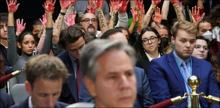 غیر ملکی میڈیا رپورٹس کے مطابق کانگریس میں اسرائیل اور یوکرین کے لیے فنڈنگ لینے کے لیے آئے امریکی وزیر خارجہ اور وزیر دفاع کو ہزیمت کا سامنا کرنا پڑا، کانگریس کمیٹی میں غزہ پر اسرائیلی جارحیت کے خلاف احتجاج کیا گیا، اور شرکا نے سرخ رنگ سے ہاتھوں کو رنگ کر فلسطینیوں سے اظہار یکجہتی کیا۔