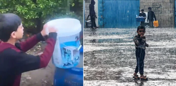 بوند بوند کو ترستے فلسطینوں پر اللہ نے اپنی رحمت برسا دی، فلسطینی بچے بارش دیکھ کر خوشی سے نہال ہوگئے اور بارش کا پانی ذخیرہ کرنا شروع کردیا۔