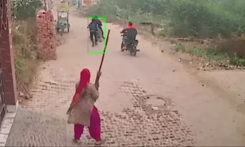 سوشل میڈیا پر وائرل ہی سی ٹی وی فوٹیج میں دیکھا جاسکتا ہے کہ خاتون بانس کی چھڑی لے کر موٹر سائیکل پر سوار حملہ آوروں کا پیچھا کر رہی ہے۔
