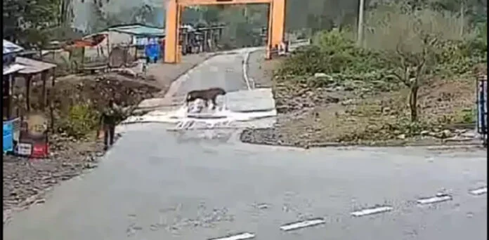 ویڈیو میں دیکھا جاسکتا ہے کہ نیشنل پارک میں ایک شخص سڑک سے گزر رہا ہے، اس دران اس کی رفتار کم ہوتی ہے اور وہ تھوڑا ٹھٹھکتا ہے۔