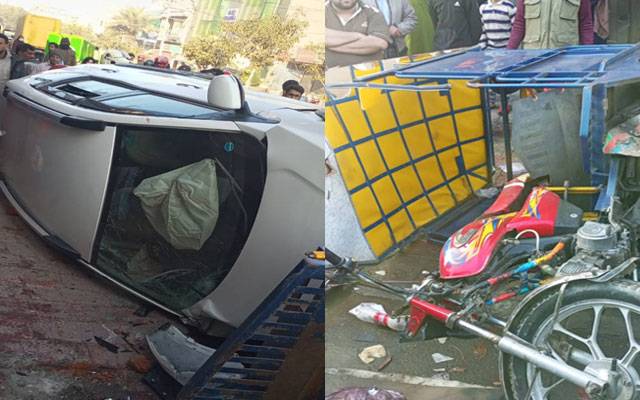 ٹاؤن شپ میں بٹ چوک کے قریب تیز رفتار کار نے رکشہ کو ٹکر مار دی، تیز رفتار کار رکشہ سے ٹکرا کر الٹ گئی،ڈرائیور موقع سے فرار ہو گیا۔