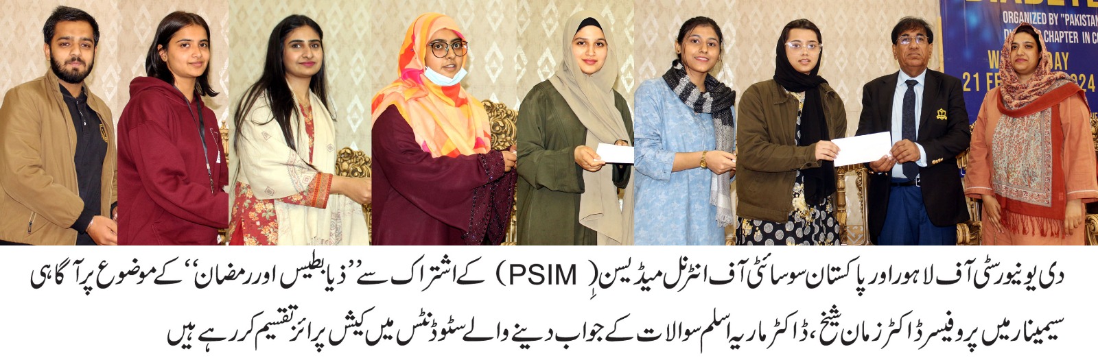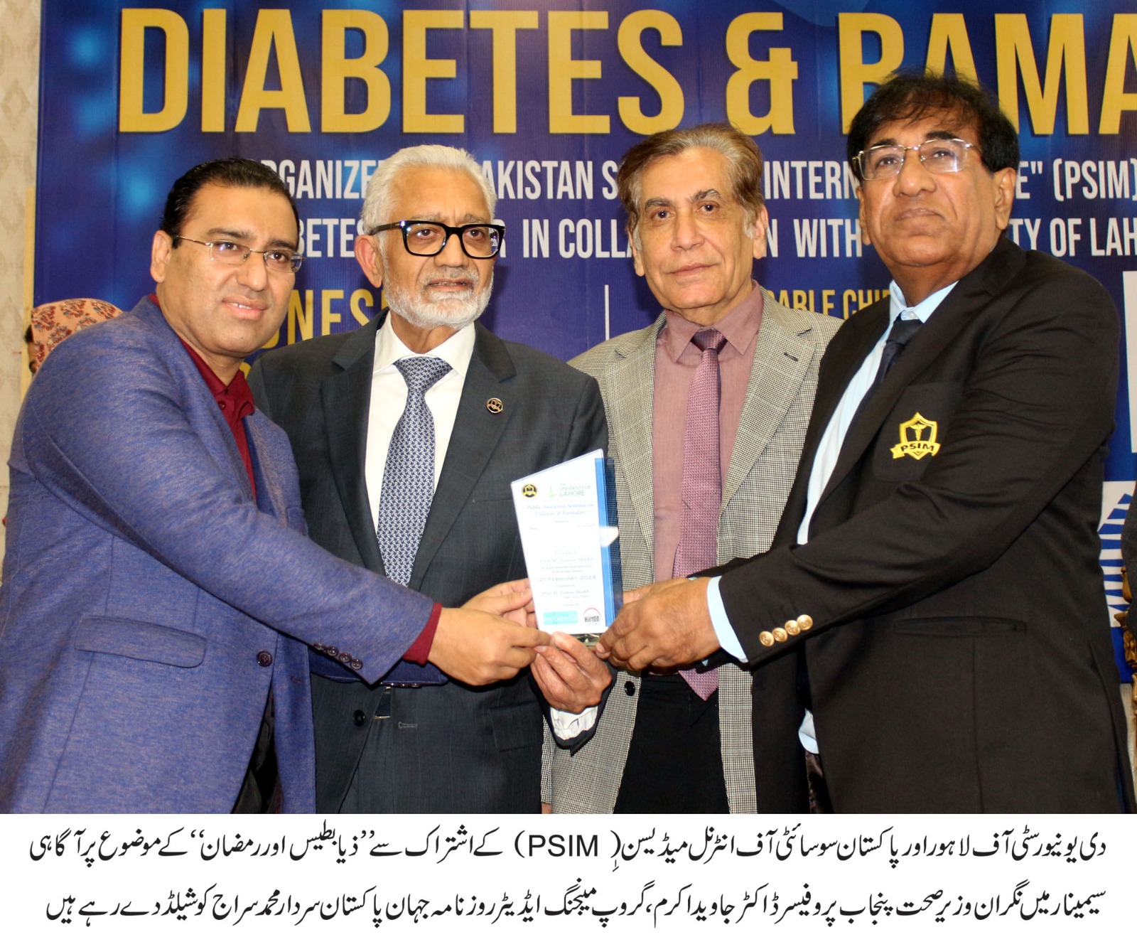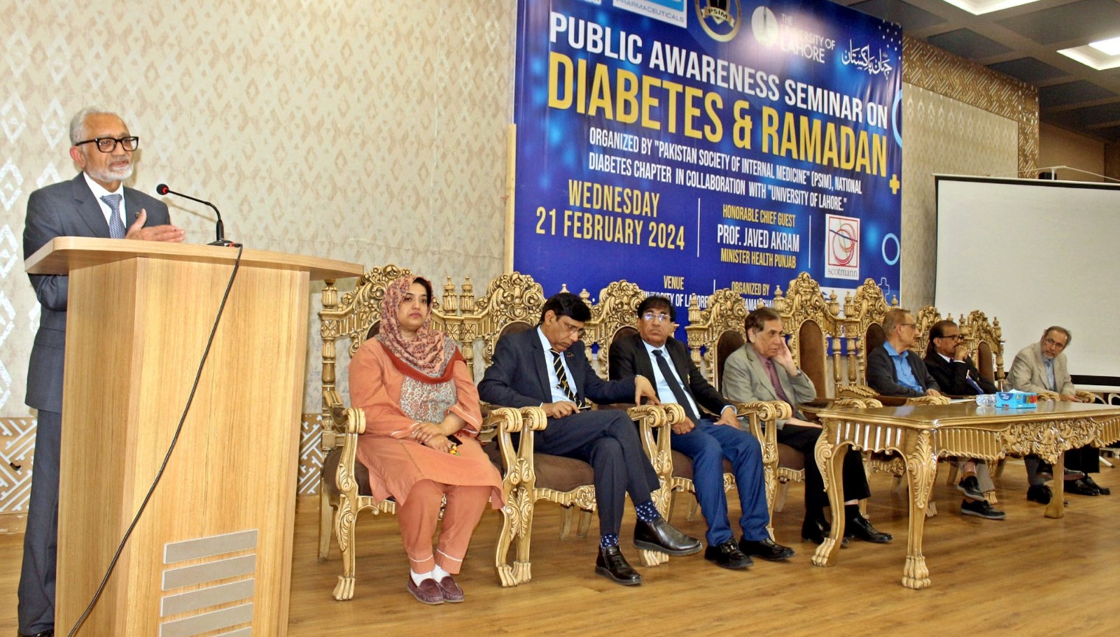 لاہور ٟ ٞدی یونیورسٹی آف لاہوراورپاکستان سوسائٹی آف انٹرنل میڈیسن ٟPSIMٞ کے اشتراک سے ٴٴذیابطیس اور رمضانٴٴ کے موضوع پر آگاہی سیمینار کا انعقاد کیا گیا جس میںنگران وزیر صحت پنجاب پروفیسر ڈاکٹرجاوید اکرم نے بطور مہمان خصوصی شرکت کی ۔