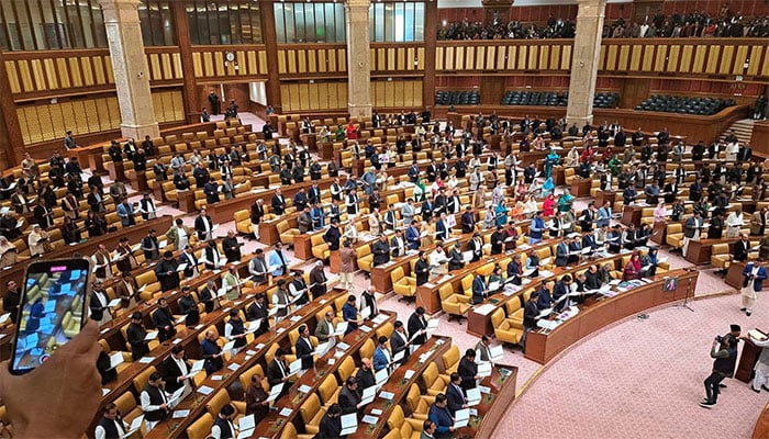 اسپیکر پنجاب اسمبلی سبطین خان کی زیر صدارت اسمبلی کا اجلاس جاری ہے، اجلاس ڈیڑھ گھنٹے تاخیر سے شروع ہوا، مسلم لیگ ن کی نامزد وزیر اعلیٰ پنجاب مریم نواز کی ایوان میں آمد پر شور شرابا ہوا، سنی اتحاد کونسل اور ن لیگ کے ارکان نے ایک دوسرے کے خلاف نعرے لگائے۔