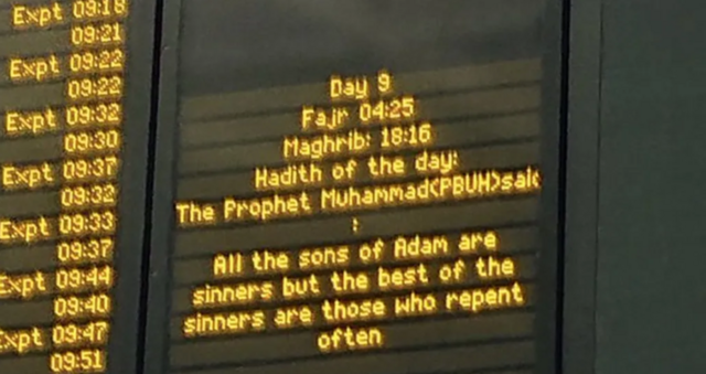 لندن کے کنگز کراس سٹیشن کے مرکزی بورڈ سے مسلم مقدس مہینے رمضان کے لیے درج ایک پیغام کو ہٹا گیا ہے۔ یہ پیغام دار اصل نبی آخر الزماں حضرت محمد صلی اللہ علیہ و آلہ وسلم کی حدیث تھی۔ برطانیہ میں ریل نظام کی کمپنی ’نیٹ ورک ریل‘ نے کہا ہے کہ یہ پیغام ٹرین روانگی کے مرکزی بورڈ پر نہیں ہونا چاہیے تھا۔